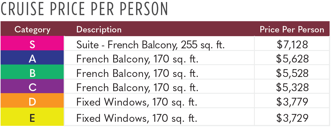 Optional land packages: Pre-cruise 2 nights Paris from $1,200 per person; Post-cruise 2 nights Reims & 1 night Chantilly from $1,770 per person.
